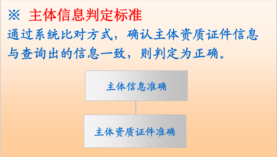 通過系統(tǒng)比對,確認主體名稱和證件號碼與查詢出的信息一致,則判定正確。